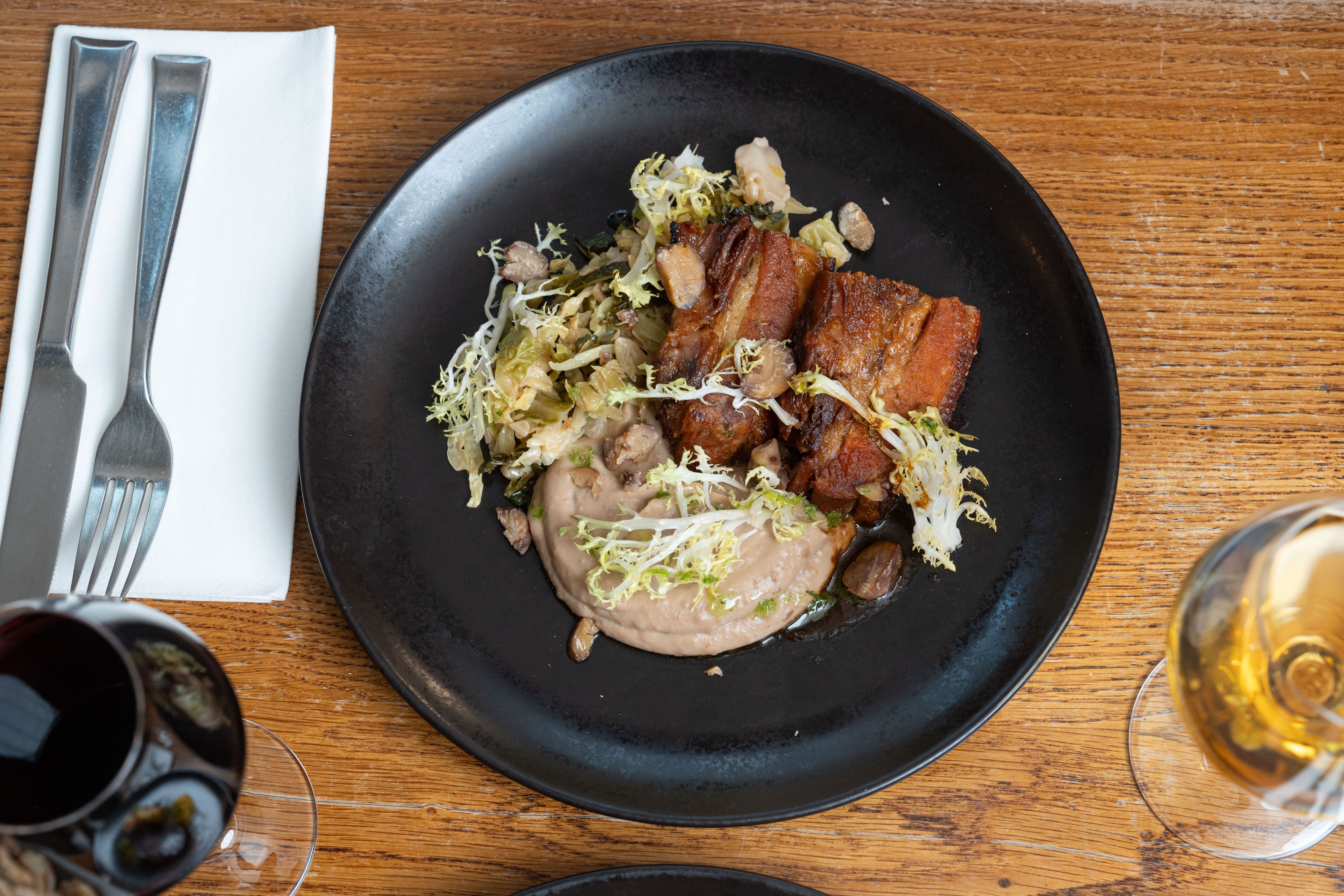 Poitrine de porc fondante, purée de châtaigne, chou vert braisé, jus au lard / Melt-in-the-mouth pork belly, chestnut purée, braised green cabbage, bacon jus
