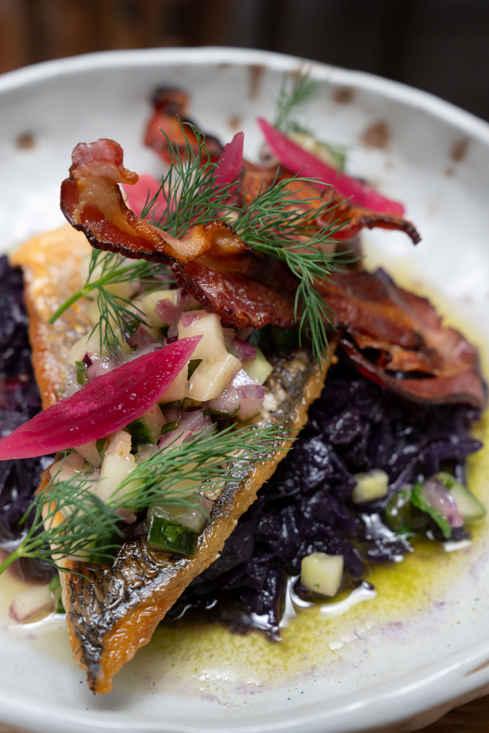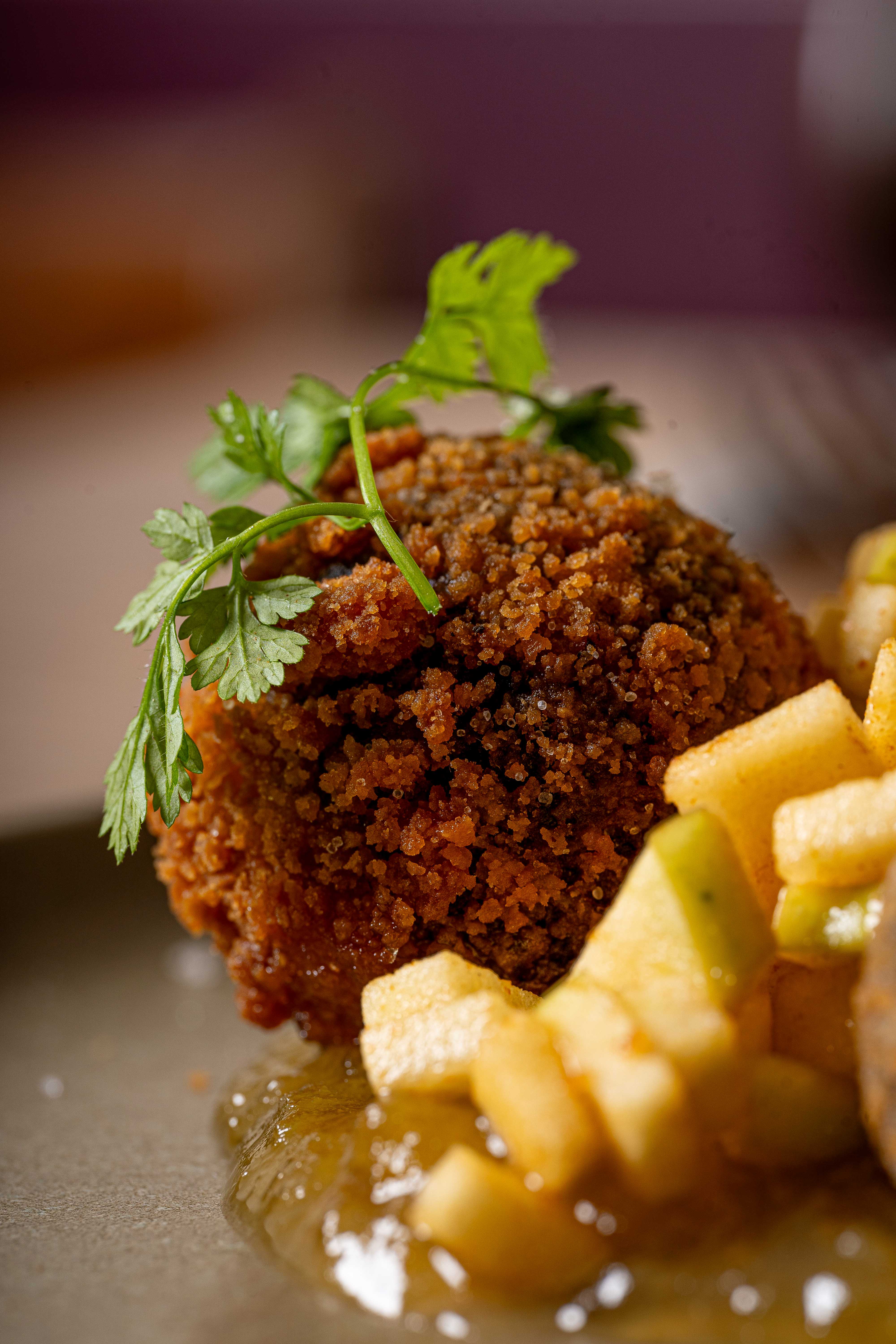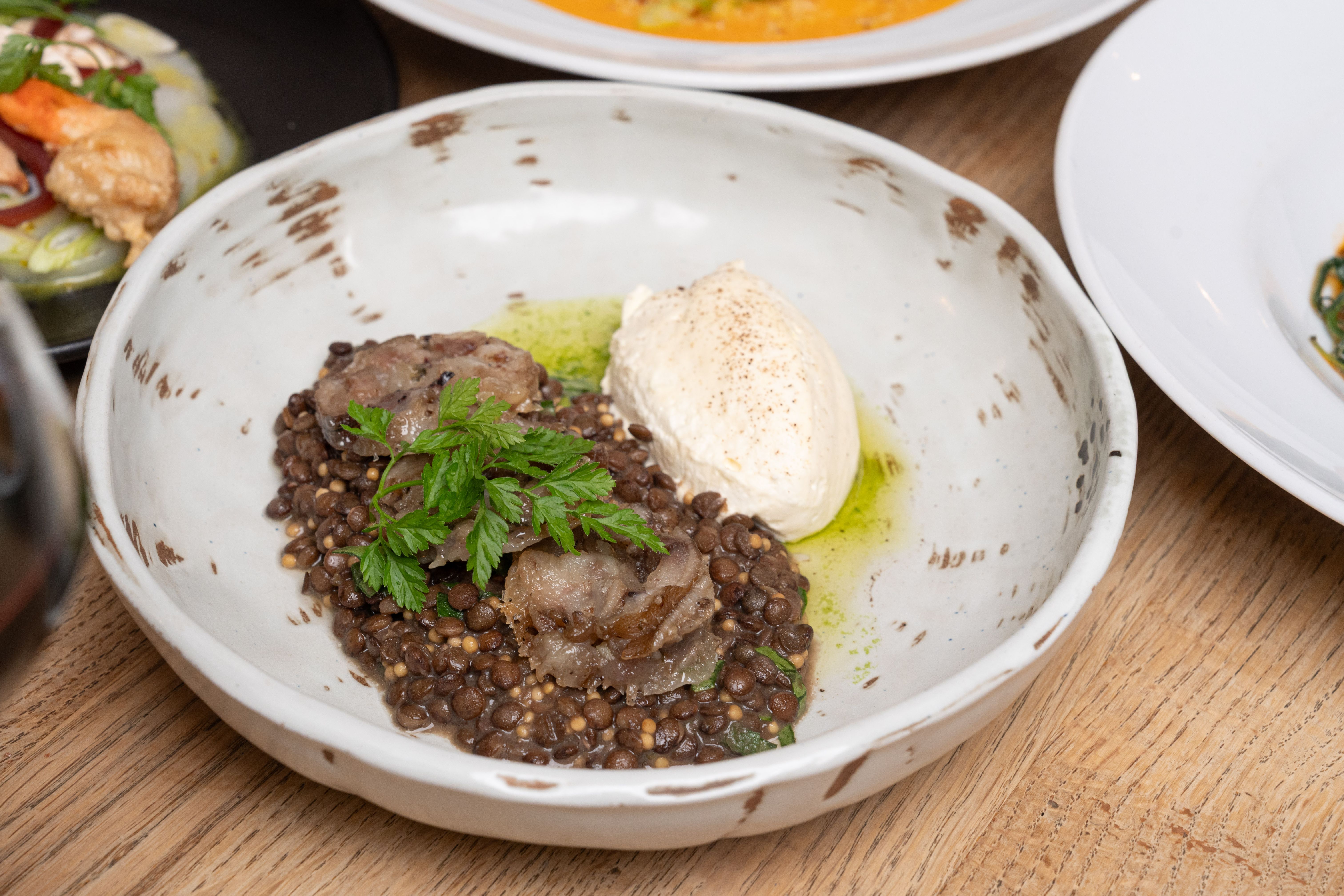 Salade de lentilles vertes, pieds de cochon croustillants, crème montée à la moutarde / Green lentil salad, crispy pig’s trotters, whipped mustard cream