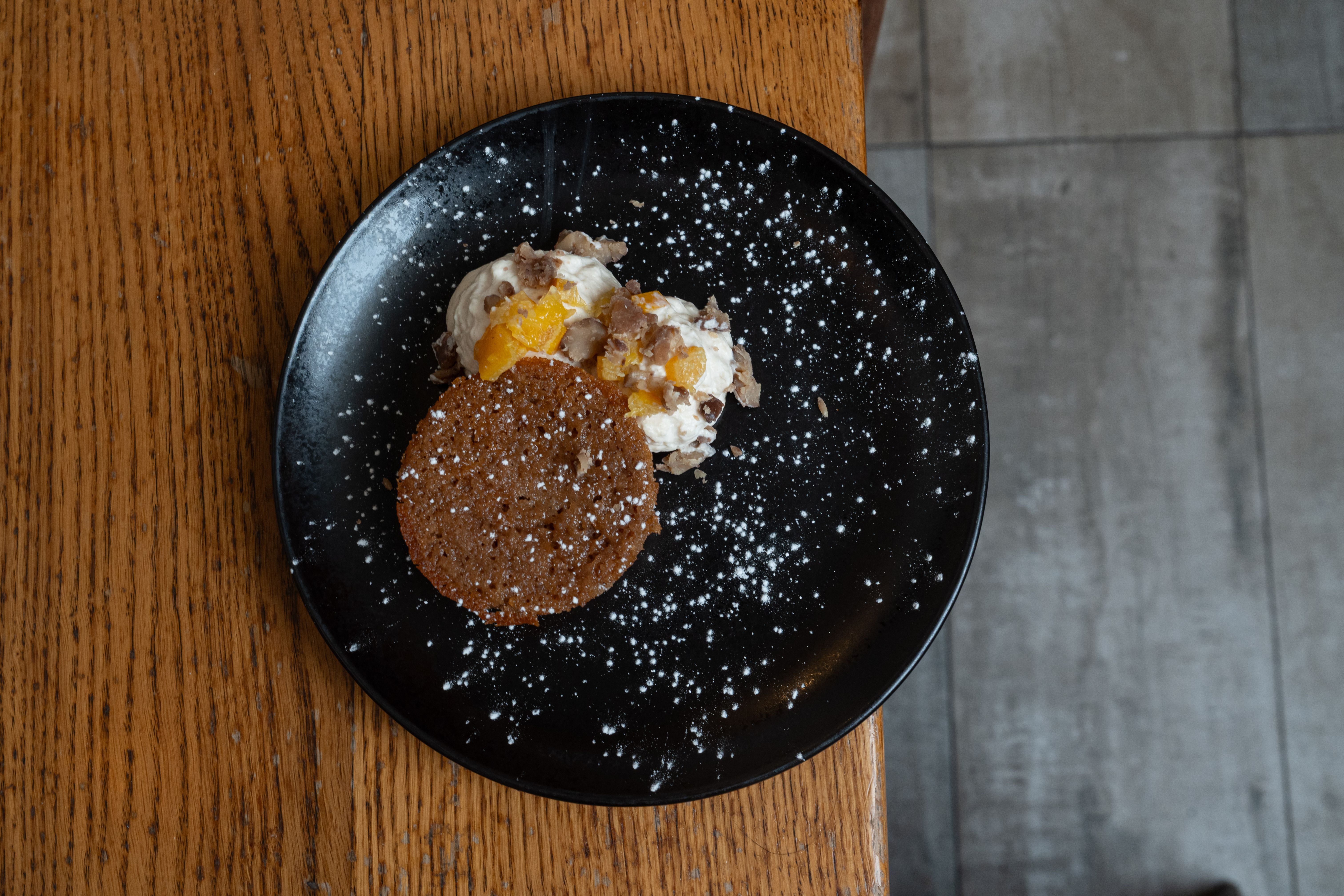 Moelleux aux châtaignes, oranges confites, chantilly à la crème de marron / Chestnut fondant, candied oranges, chestnut cream chantilly