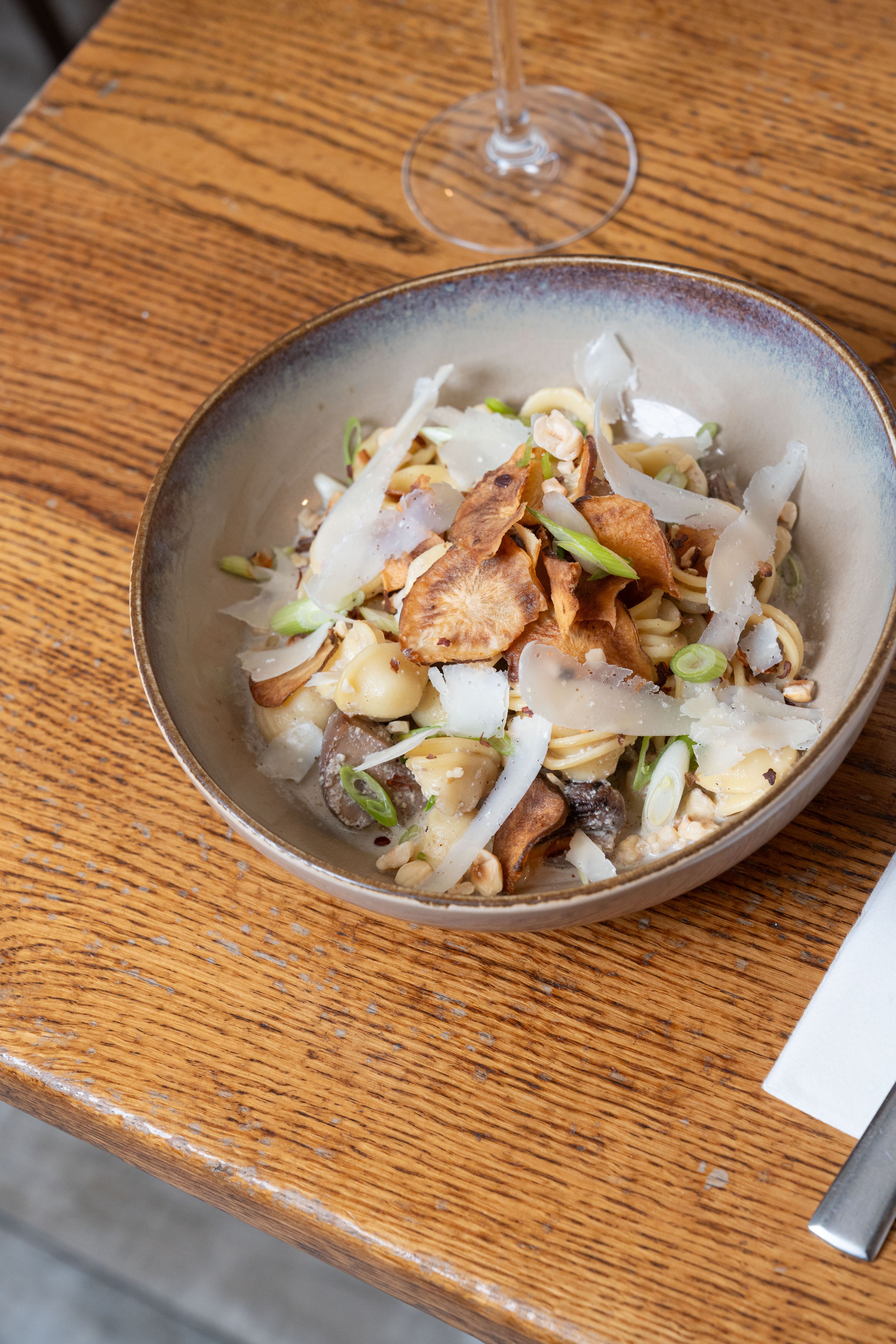 Orecchiette crémeuses aux topinambours, champignons poêlés, parmesan et noisettes / Creamy orecchiette with Jerusalem artichokes, sautéed mushrooms, parmesan and hazelnuts