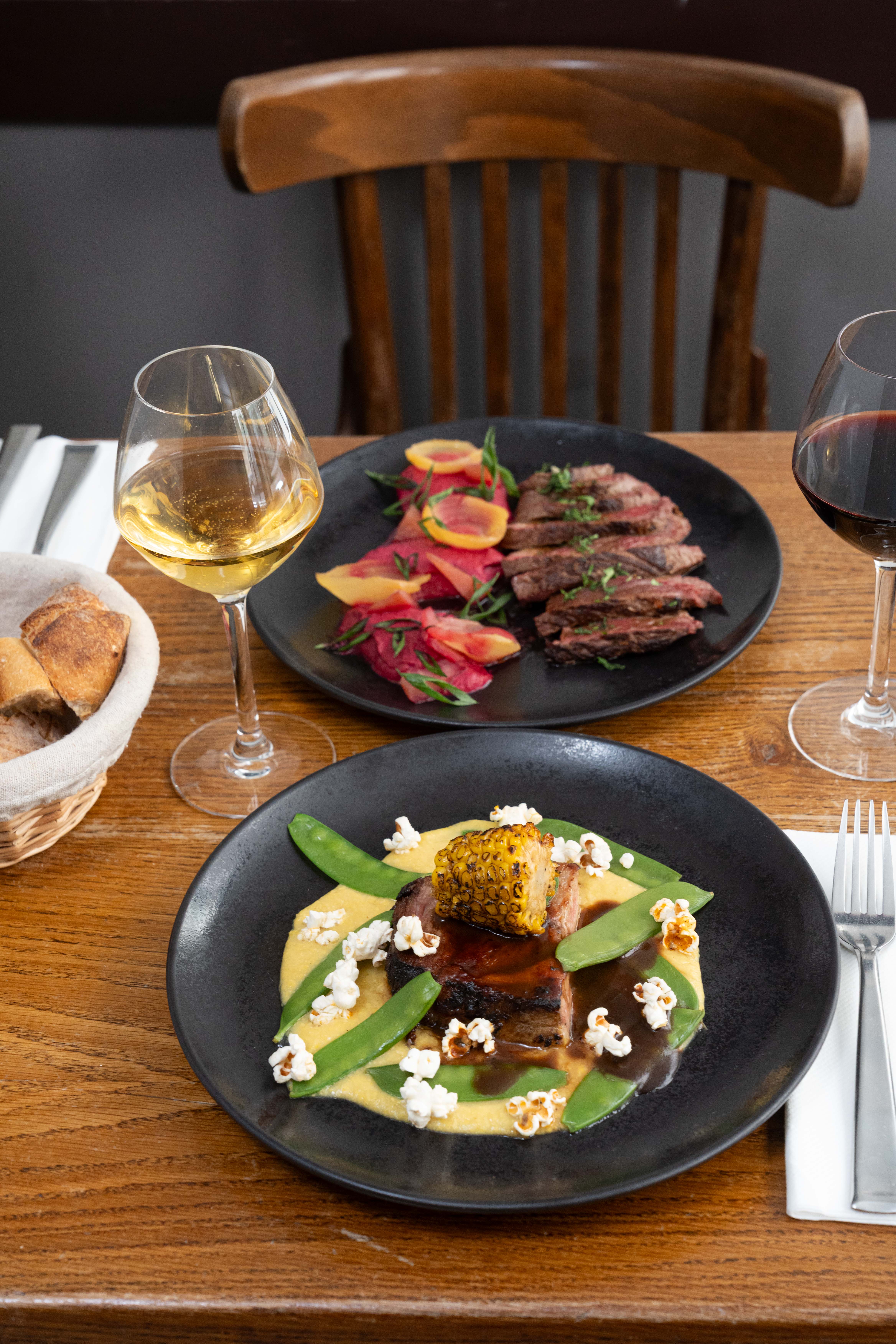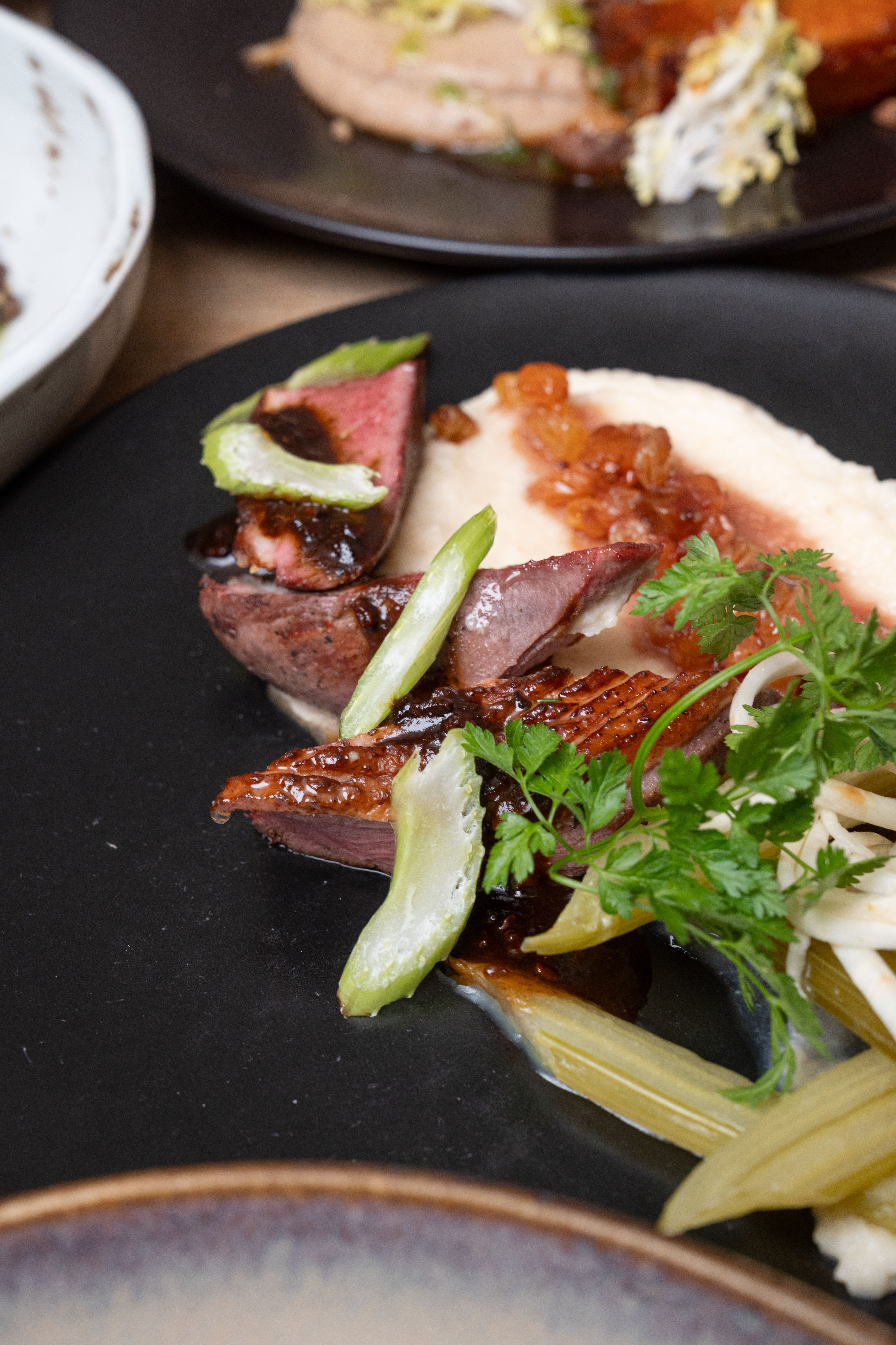 Magret de canard, céleri en texture, raisin confit au Porto, jus au cacao / Duck breast, textured celery, port-glazed grapes, cocoa jus