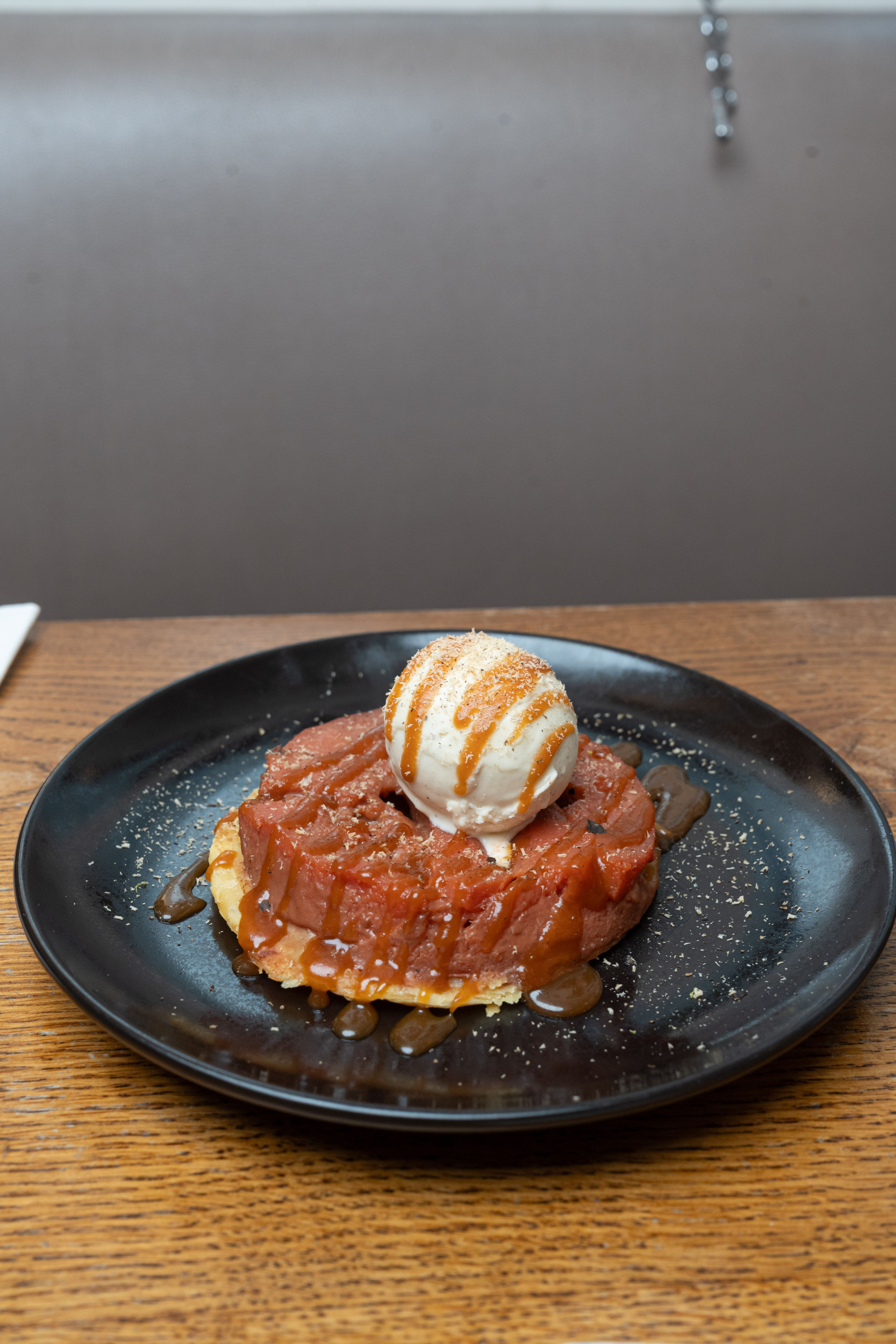 Tatin aux coings, caramel beurre salé, glace vanille tonka / Quince tarte Tatin, salted butter caramel, tonka vanilla ice cream