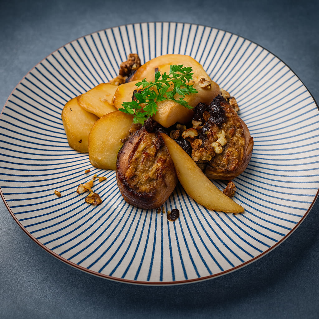 Boudin noir, écrasée de pommes de terre, pommes caramélisées, sauce au miel — Black pudding, mashed potatoes, caramelized apples, honey sauce