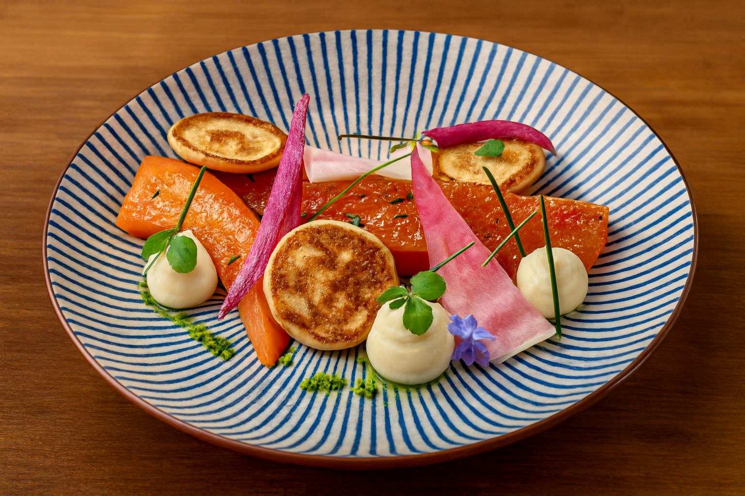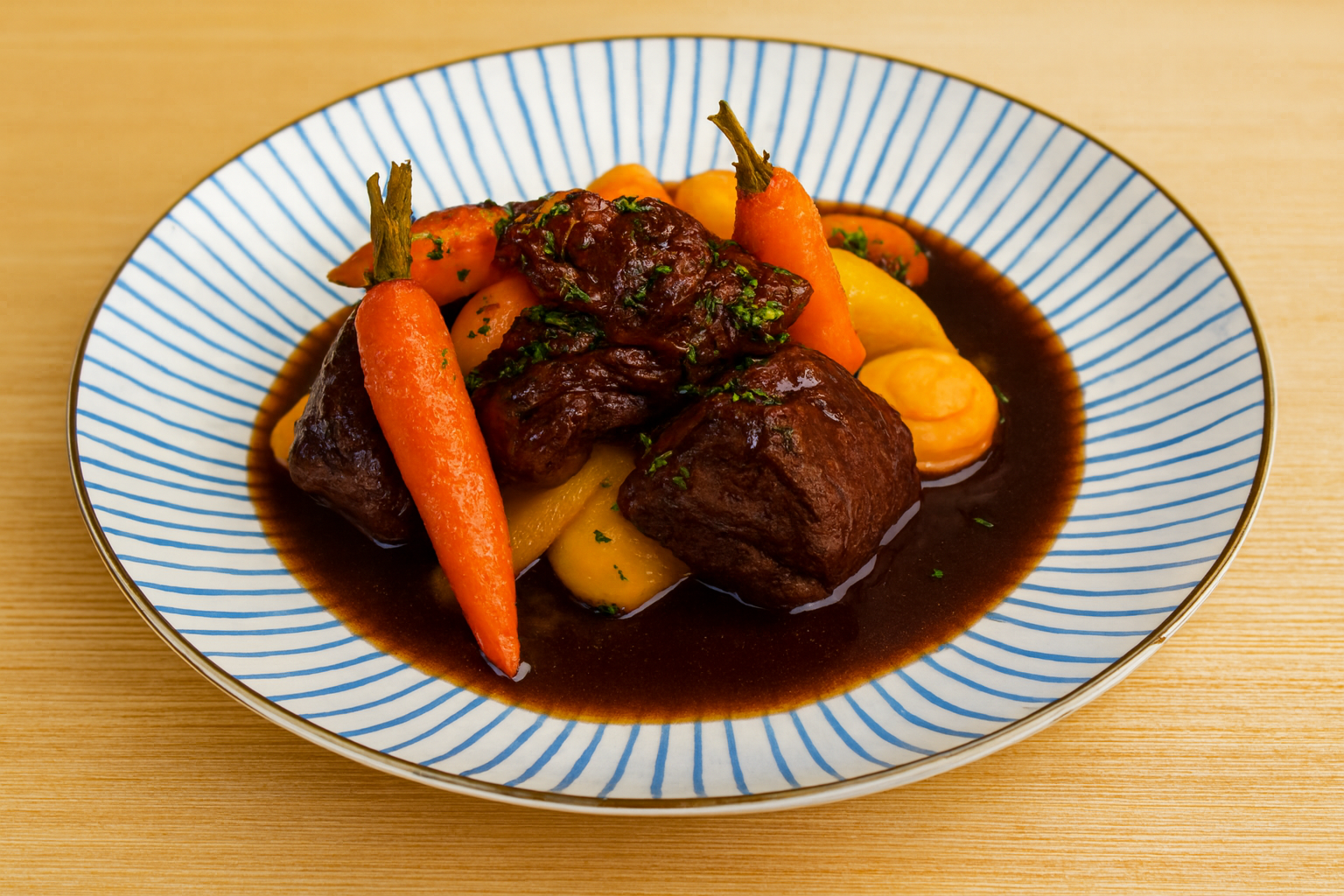Bœuf aux carottes fanes pommes de terre fondantes crème de carottes au gingembre / Beef with young carrot tops fondant potatoes ginger‑carrot cream