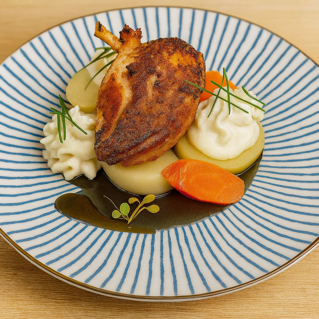 Suprême de volaille rôti au citron confit légumes racines glacés et espuma romarin / Roast chicken supreme preserved lemon glazed root vegetables and rosemary espuma